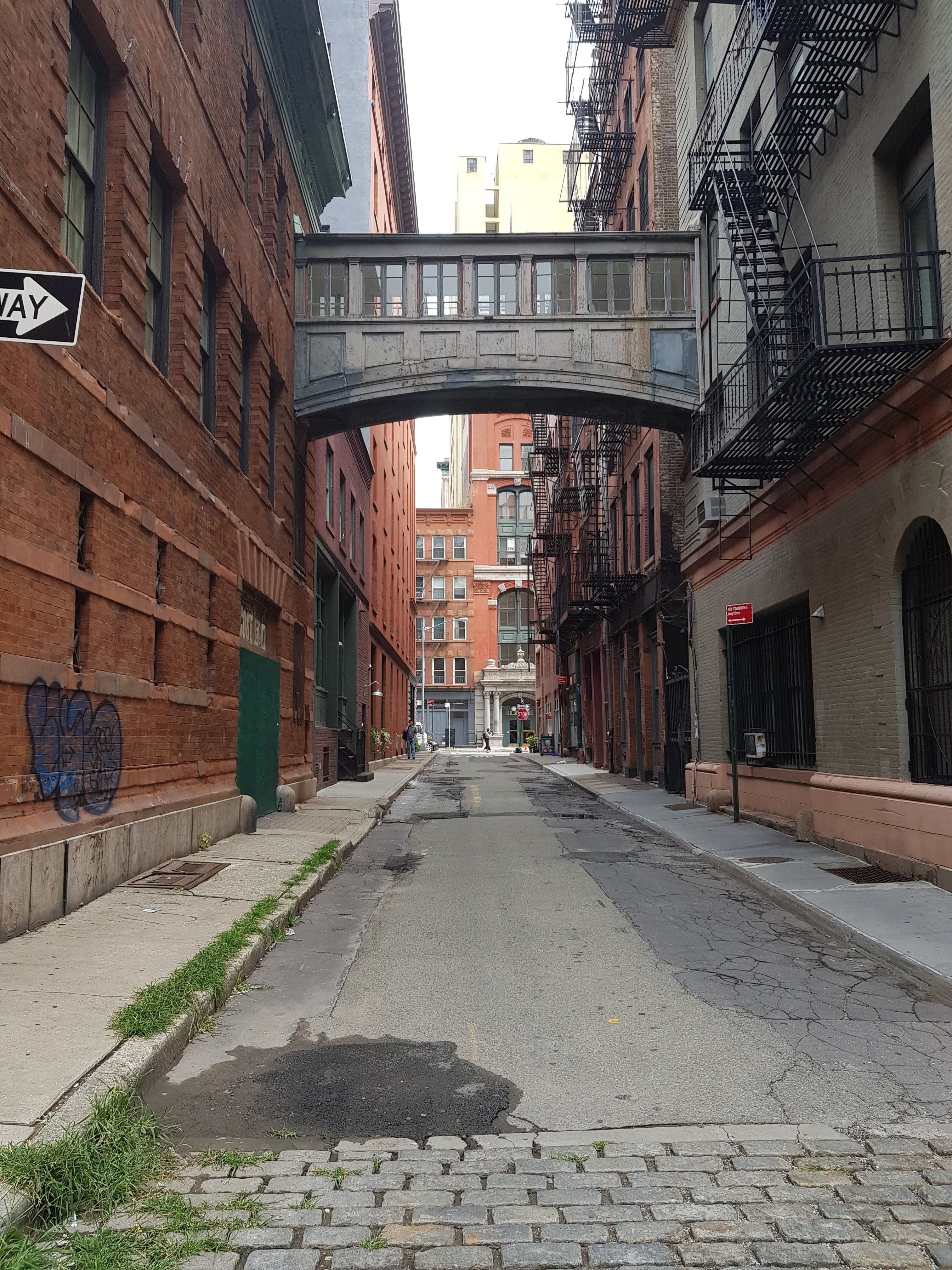 Une petite passerelle entre deux vieux bâtiments en brique. Un reste du vieux New York. C'est tranquille ici. C'est joli.